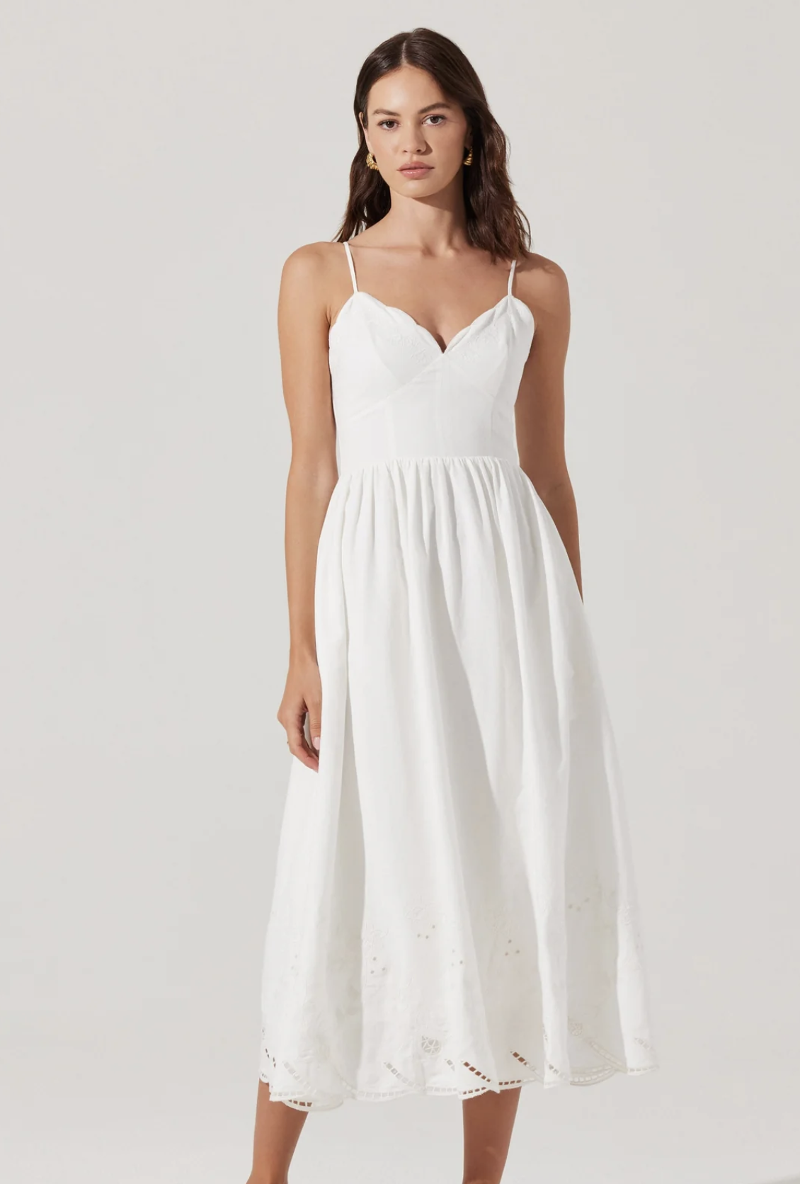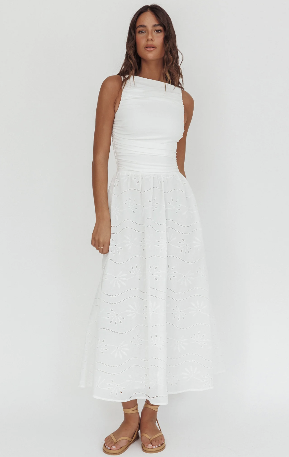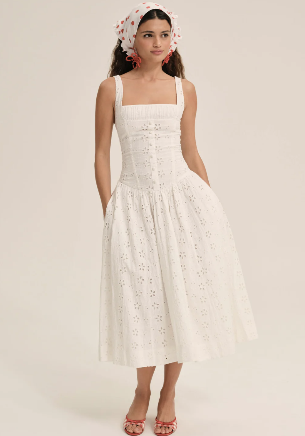 This white eyelet drop waist midi is a white graduation dress daydream, and did we mention it has POCKETS! The gathered skirt and ultra feminine silhouette make this one so easy to love.