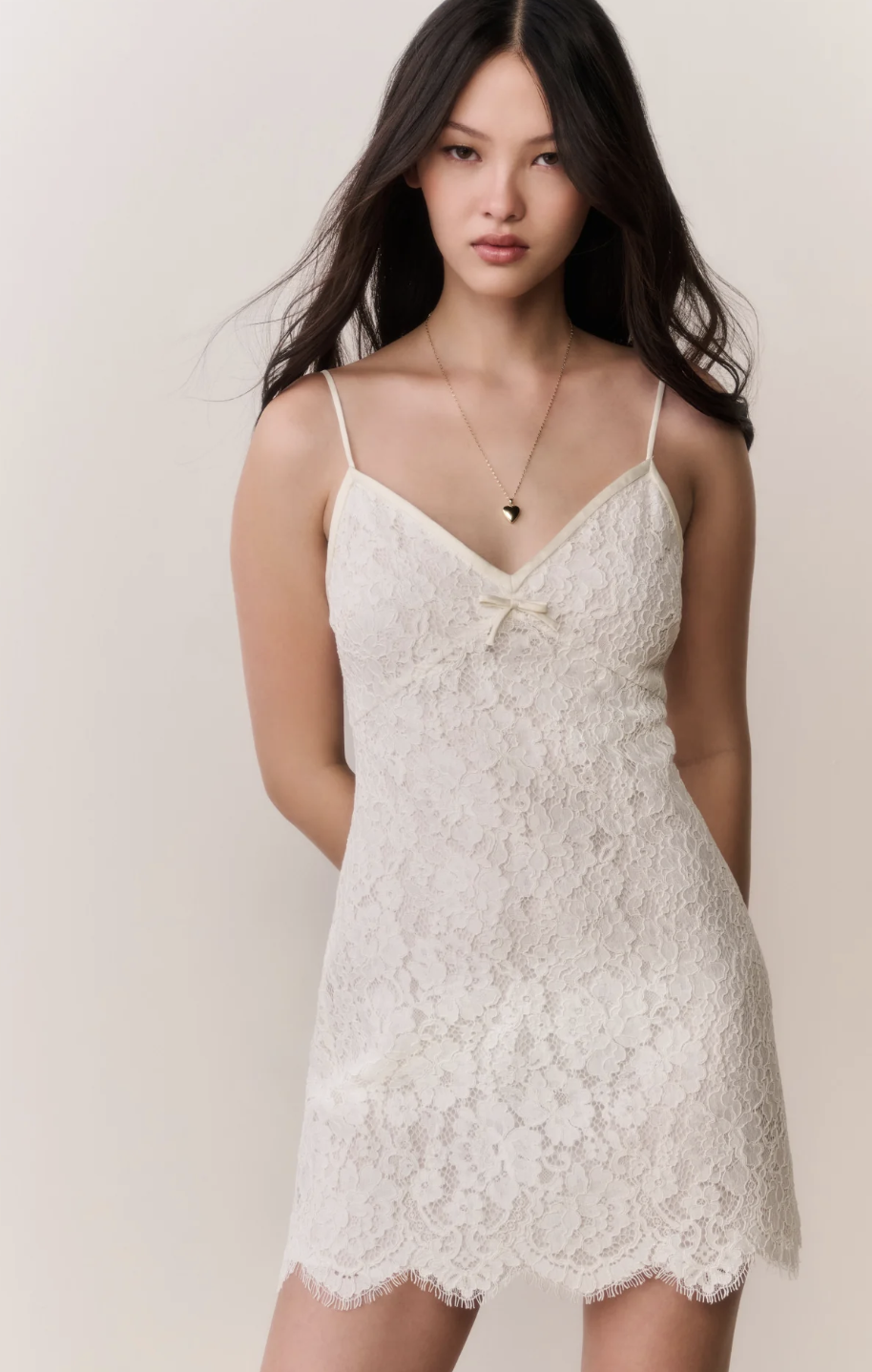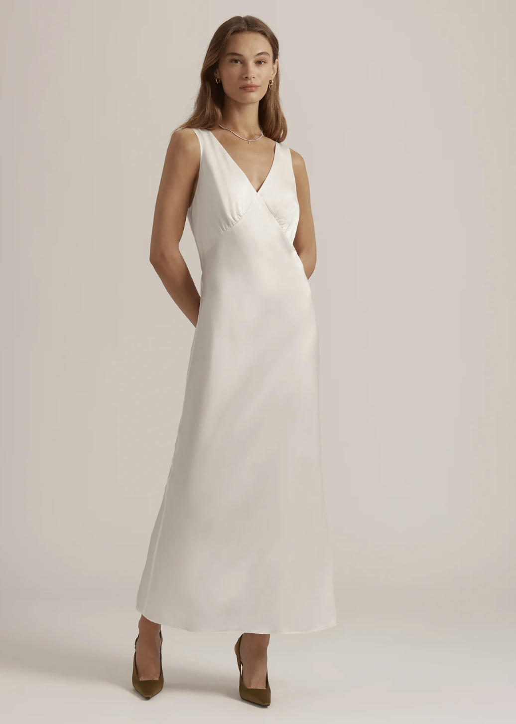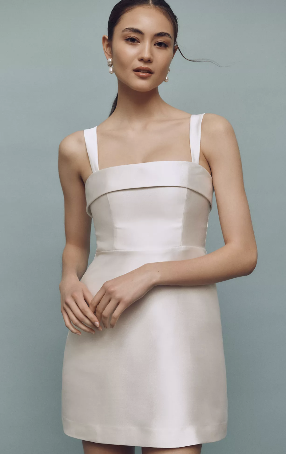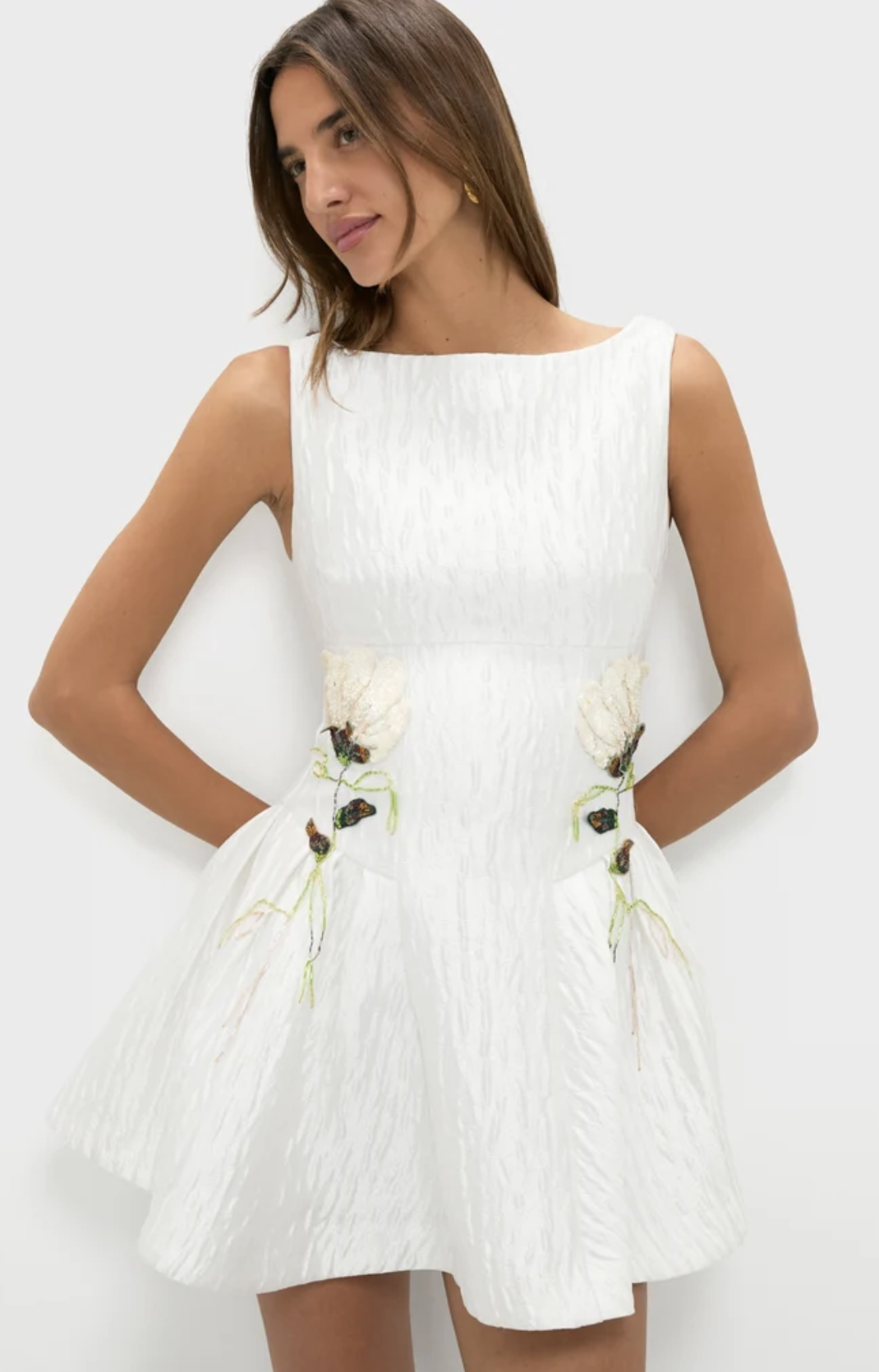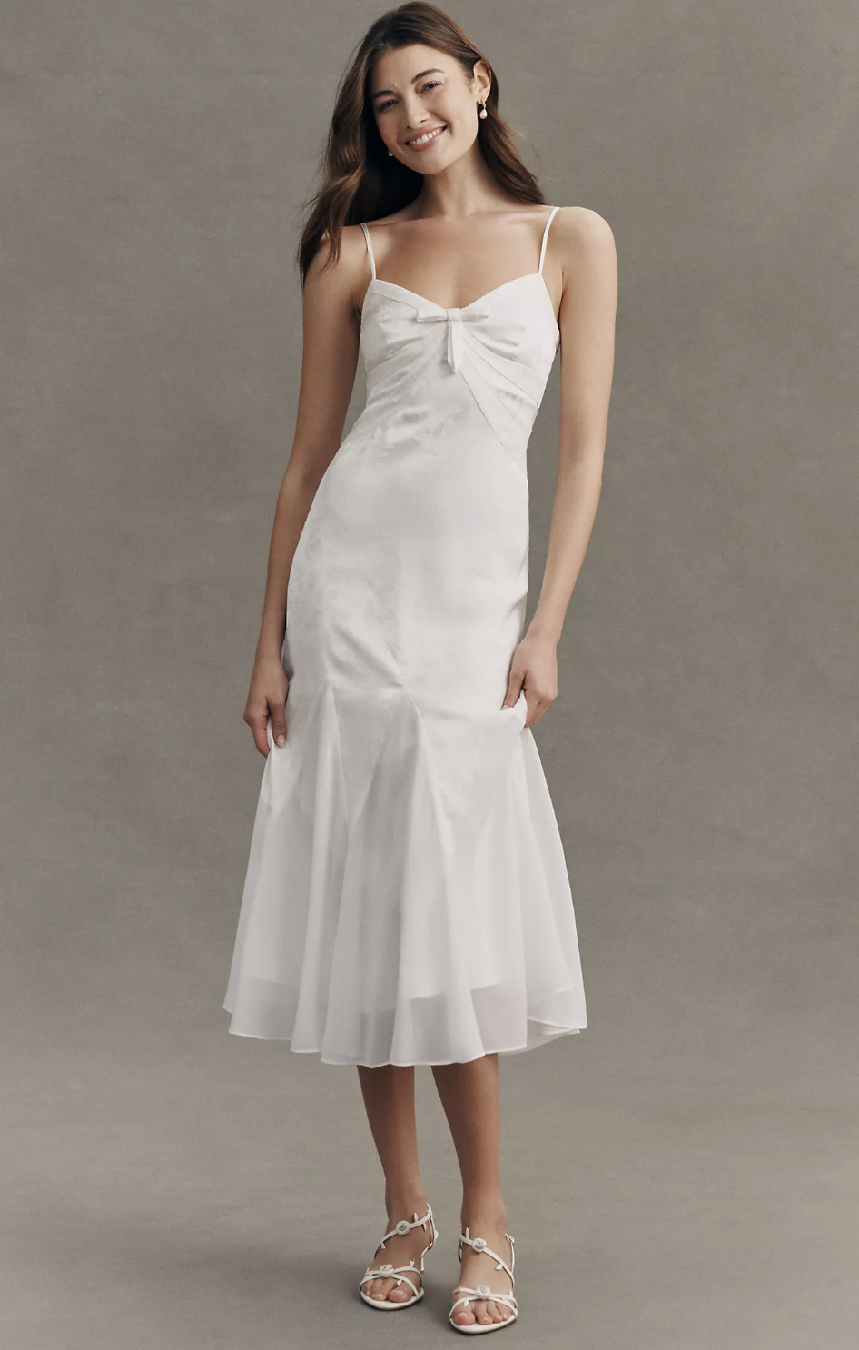 A chic white graduation dress with a subtle jacquard texture and an easy slip silhouette. It feels minimal but still special, perfect for a modern, understated graduation outfit!
