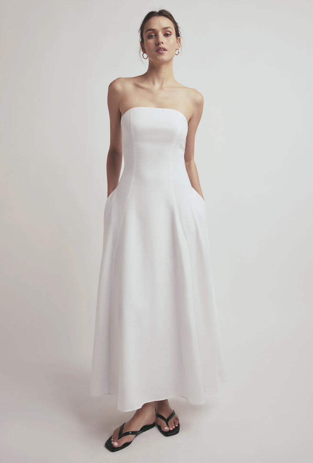 From the strapless to the pockets, I love this shape a lot. It’s elegant but will keep you cool with the linen fabric!