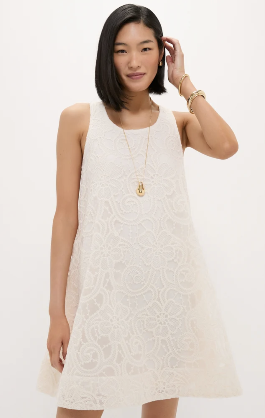 This white dress has a flattering A-line shape that moves beautifully and feels comfortable all day. The delicate floral lace texture adds subtle dimension and a touch of elegance. With its clean lines and soft scoop neckline, it’s a simple yet special choice for graduation.