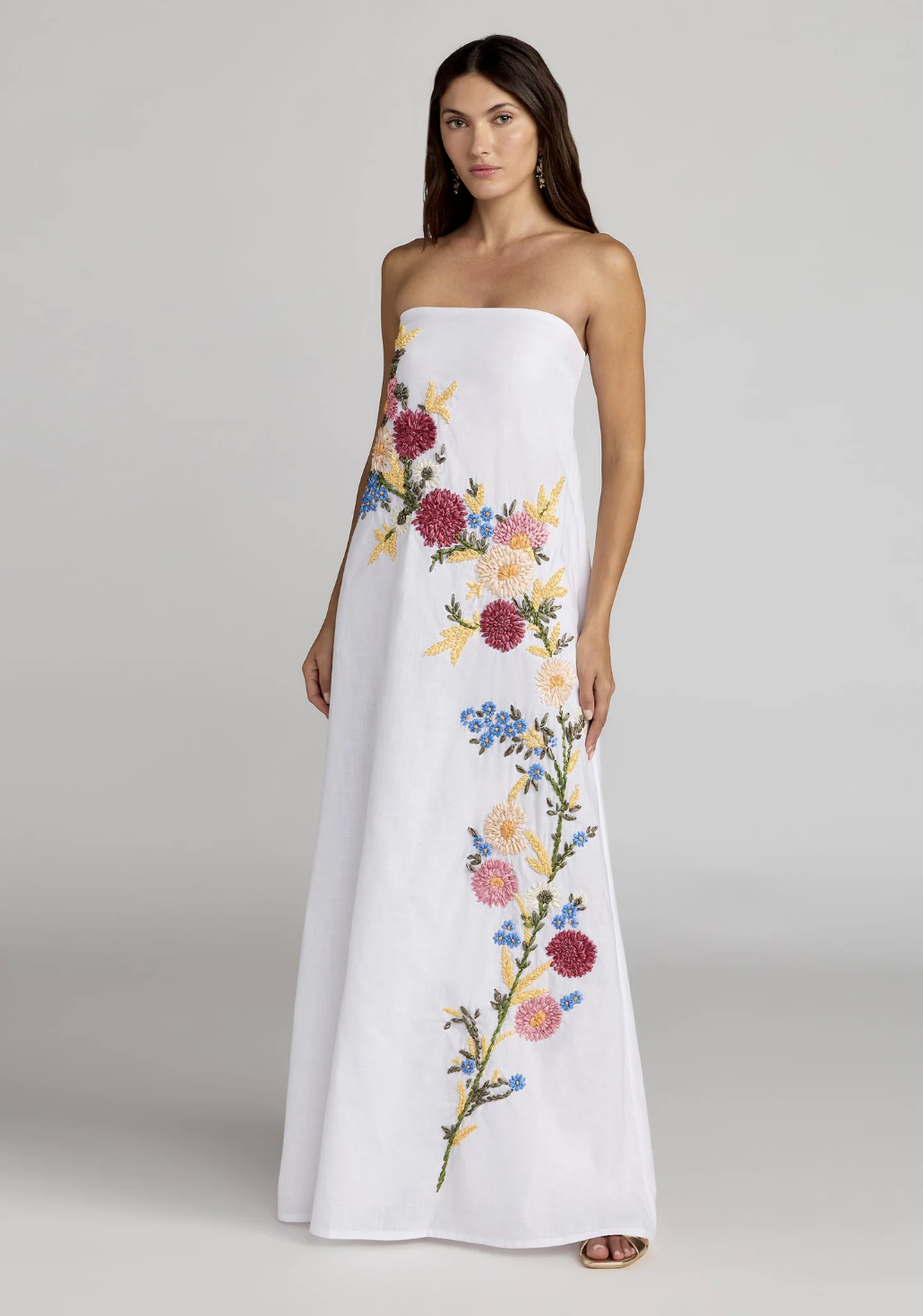 An elegant graduation dress with delicate floral embroidery and a strapless neckline. Lightweight linen keeps it breathable, perfect for a polished graduation outfit. With a pop color too for spring!